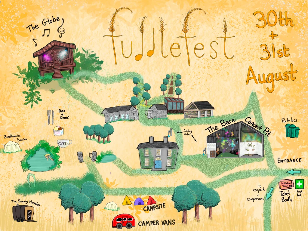 FuddleFest 2025 takes place over the 30th and 31st of August. This year’s festival kicks off with an orchestral concert at 2pm on the main stage in The Barn. From there the audience will be drawn through the gardens of Fuddletown to the beautiful wooden ‘Globe’ stage, the Concert Pit (formerly a silage pit!), and to various nooks and crannies on the grounds that will host installations and musical events, continuing late into the night. Festival-goers are invited to camp in our campsite under the oak trees and wake up to hear the morning coffee concert, followed by various performances which will brings the festival to a close in the early evening of Sunday 31st.